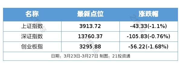 上周A股已往一周(3月23日—3月27日)A股三大指数颠簸收跌。结果3月27日收盘,上证指数报3913.72点,周跌1.1%;深成指报13760.37点,周跌0.76%;创业板指报3295.88点,周跌1.68%。