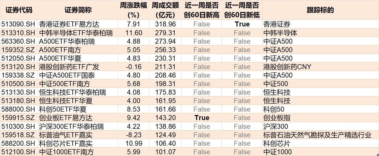 本周,股票型ETF和跨境型ETF成交额超100亿元的ETF有16只。其中,香港证券ETF易方达周成交额超300亿元。
