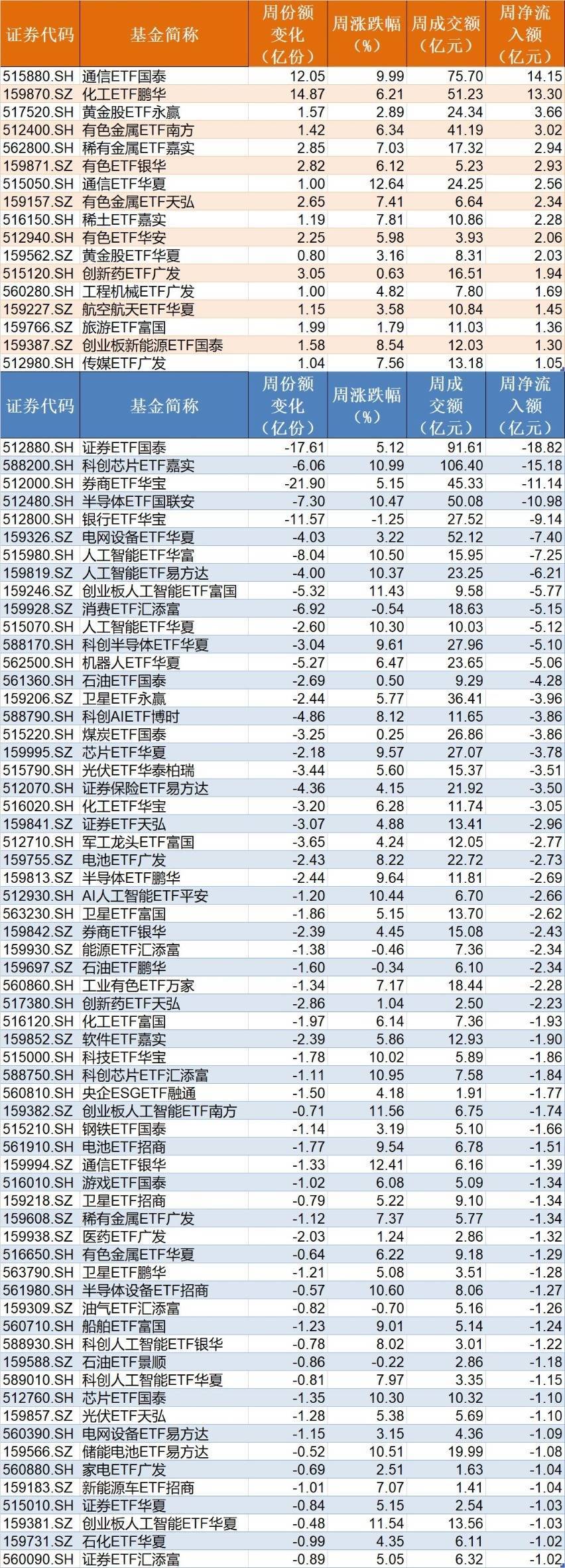 在资金流出方面,本周有63只行业主题ETF净流出逾1亿元,其中证券ETF国泰、科创芯片ETF嘉实、券商ETF华宝份额分手减少17.61亿份、6.06亿份和21.9亿份,分手净流出资金18.82亿元、15.18亿元和11.14亿元。