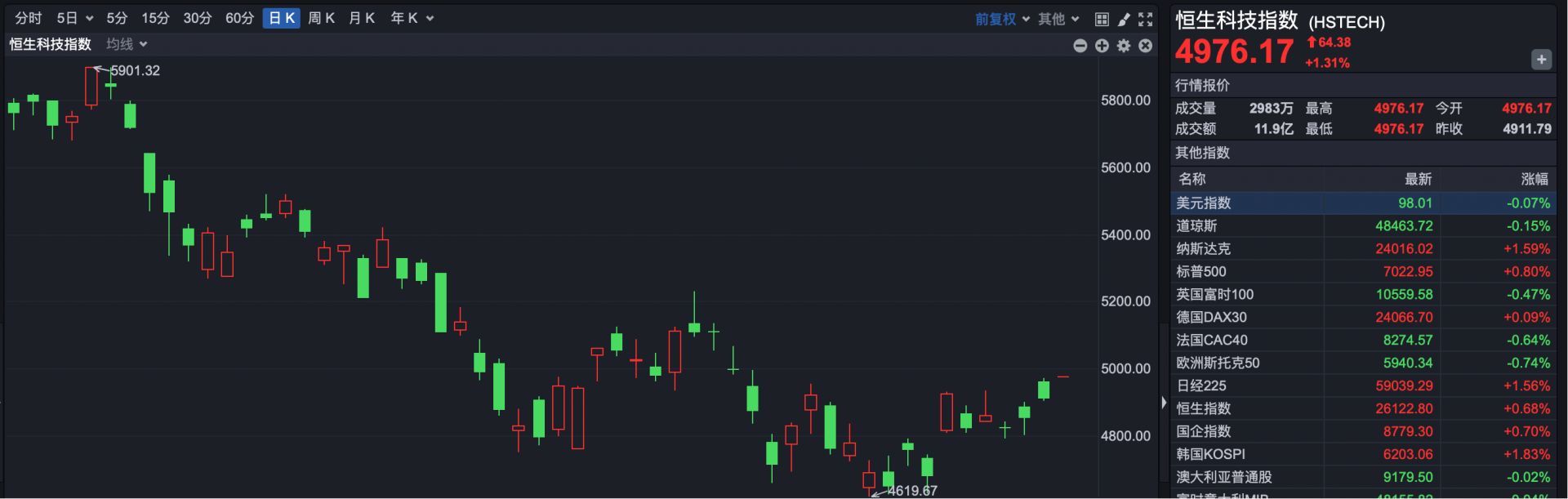 恒生科技指数开盘报4976.17点,飞腾64.38点,涨幅1.31%。