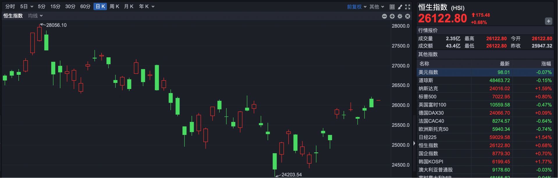 早间开盘,恒生指数开盘报26122.80点,飞腾175.48点,涨幅0.68%。
