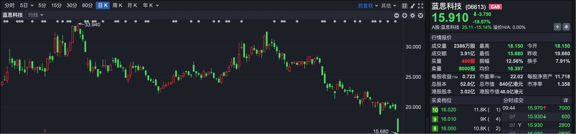 此外,蓝念念科技(HK06613)早盘一度跌超19%,股价创港股上市以来新低。