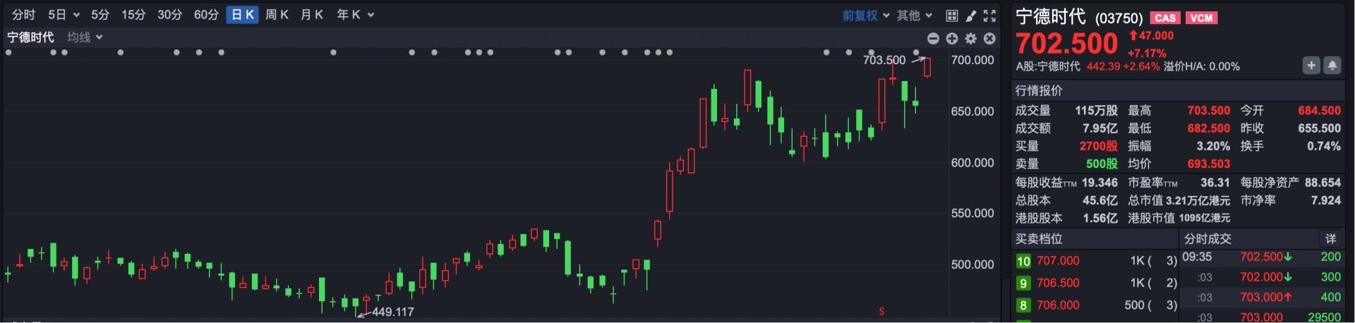 市集热门方面,宁德时期(HK03750)高开超4%后,涨幅朝上7%,再创港股上市以来新高。