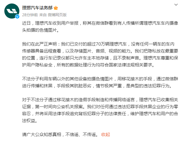 4月15日,@理思汽车法务部 发文称,近日收到用户举报,称其在微信群看到有东说念主传播所谓理思汽车车内录像头拍摄的色情图片。
