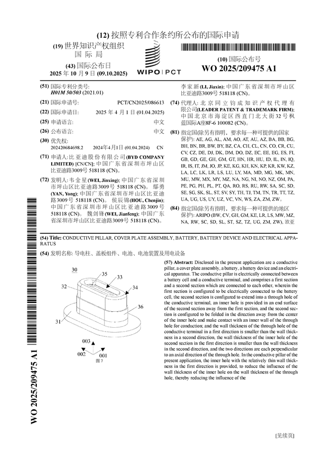 证券之星讯息,把柄企查查数据清晰比亚迪(002594)公布了一项海外专利苦求,专利名为“导电柱、盖板组件、电板、电板安装及用电缔造”,专利苦求号为PCT/CN2025/086613,海外公布日为2025年10月9日。