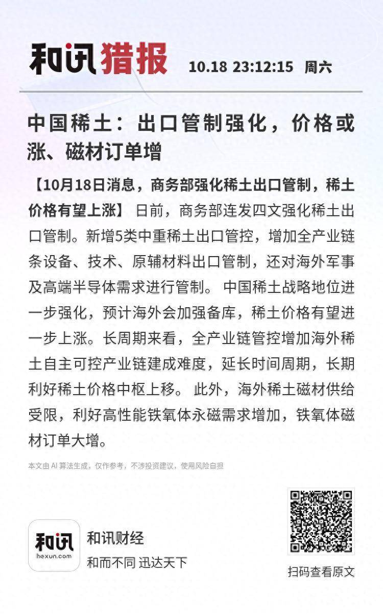 【10月18日音讯,商务部强化稀土出口不时,稀土价钱有望上升】日前,商务部连发四文强化稀土出口不时。新增5类中重稀土出口管控,增多全产业链条竖立、技巧、原辅材料出口不时,还对国外军事及高端半导体需求进行不时。 中国稀土计谋地位进一步强化,瞻望国外会加强备库,稀土价钱有望进一步上升。长周期来看,全产业链管控增多国外稀土自主可控产业链建成难度,延永劫期周期开云kaiyun中国官方网站,恒久利好稀土价钱核心上移。 此外,国外稀土磁材供给受限,利好高性能铁氧体永磁需求增多,铁氧体磁材订单大增。