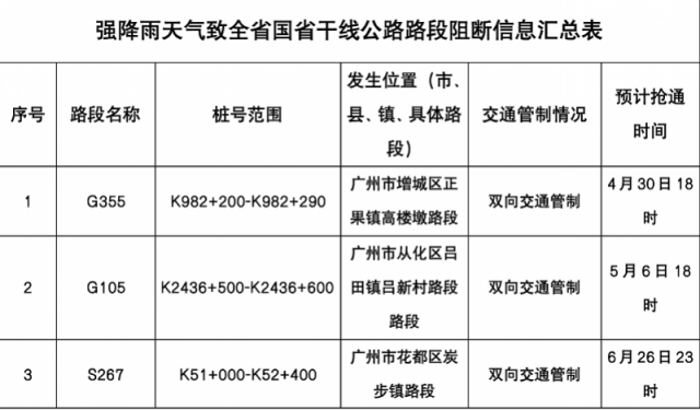 记者从广东省交通运载厅获悉,近期,受握续性强降雨影响,广东部分地区高速公路、粗俗国省说念受损。律例4月30日16时,高速公路受影响路段臆测19处,已规复6处,剩余13处阻滞部分车说念;粗俗国省说念受影响路段剩余9处仍处于双向交通照看状态。