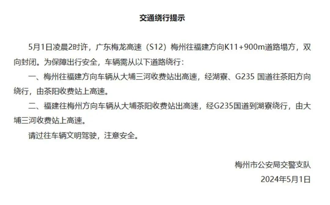 梅州市以及大埔县公安、救急、消防、卫健等干系部门前去现场开展提拔。当今,梅大高速两边向车说念已一皆阻滞,车辆需扎眼绕行。